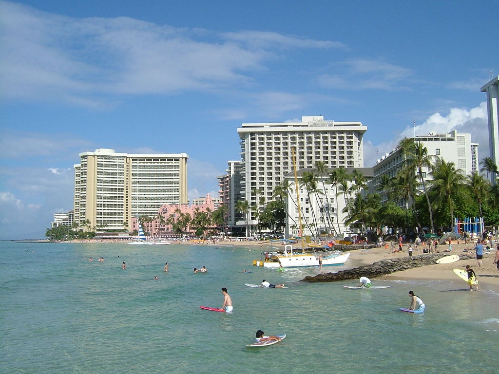 Yet the Moana still remains one of Hawaii’s two most-recognized and architecturally-iconic hotels. The original (Banyan) wing of the hotel is now listed on the National Register of Historic Places, and the old courtyard banyan tree has been designated as Hawaii’s “Millennium Landmark Tree,” joining a select group of one-per-state historic trees that will remain protected in the 21st century. In recent years, the Moana has been renamed . . . it is now the Moana Surfrider, a Westin property. The original 1901 portion of the hotel is known as the Historic Banyan Wing. The annexed low-rise 1952 SurfRider Hotel (Diamond Wing) and the 1969 Surfrider Hotel (Tower Wing) complete the structure.
